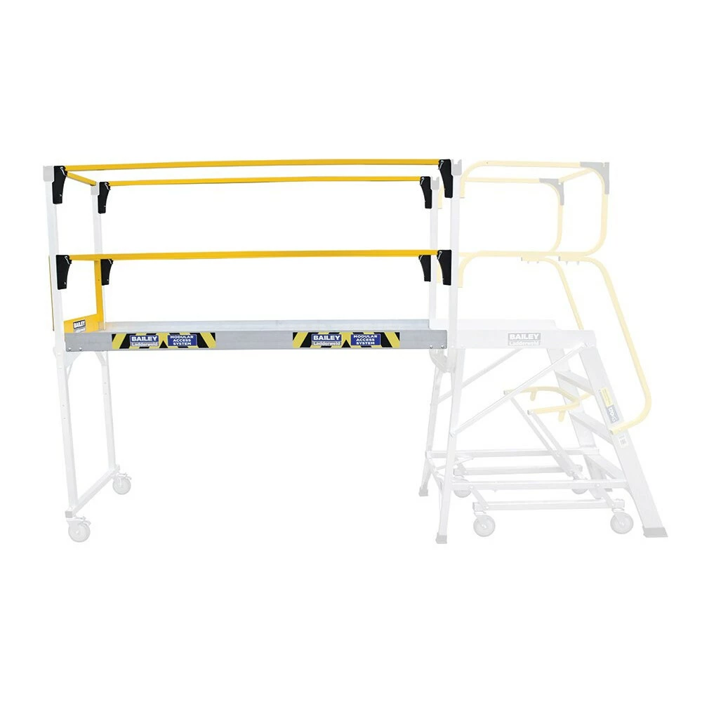 The Bailey FS13790 Modular Access System 2.0m Platform allows the end user to customize the platform length at variable heights anD-shapes that suits the desired application. This system increases safety and efficiency in the work place. The off the shelf solution means there is no huge capital cost or long lead times. Specifically designed for use in the transportation industries, aviation and aircraft maintenance, manufacturing and process industries, heavy equipment maintenance, material handling and stock picking, warehousing, defense and mining industries.