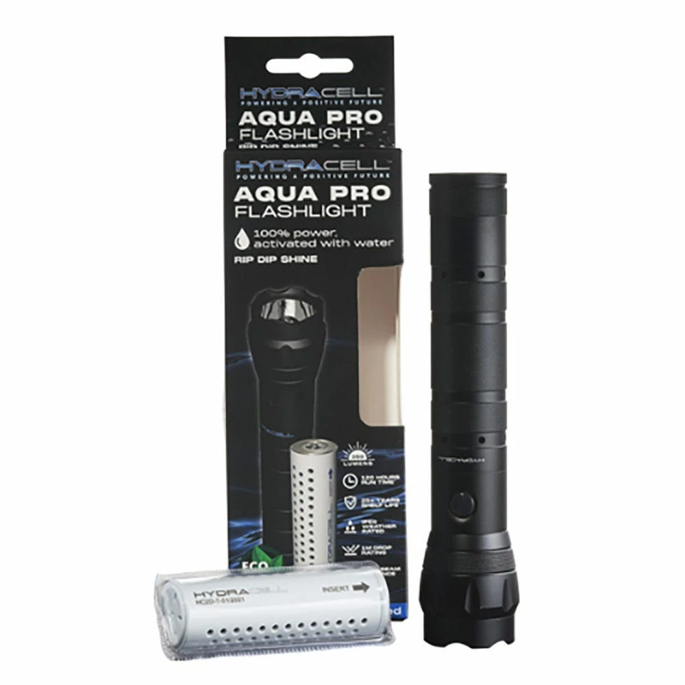 The HYDRACELL™ Aqua Pro Aluminium Flashlight is a high power aluminium LED flashlight powered by a proprietary HYDRACELL HC2D water activated battery fuel cell.