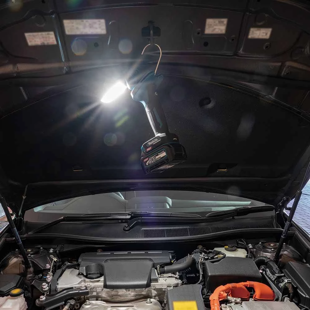 For added convenience, the flashlight head folds up and down and pivots left to right to deliver multiple lighting angles. A metal hang-hook swivels 360-degrees and folds away when not in use. The flashlight has a slim, compact design at 275mm in length and weighs only 1.42kg. (with an 40V Max 4.0Ah battery, sold separately).
