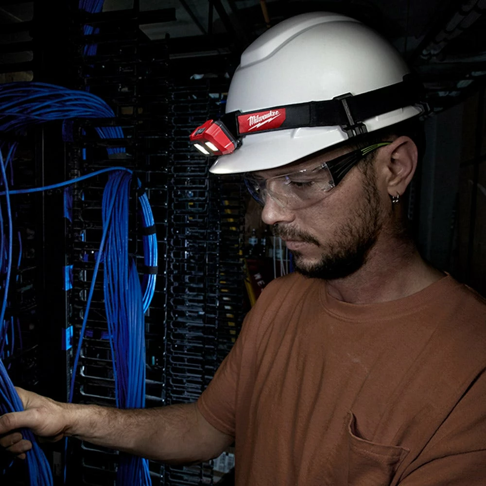 The Spot/Flood Headlamp offers more light options in a compact, lightweight design. These battery-powered headlamps (3 AAA batteries included) deliver 450-Lumens of TRUEVIEW™ High Definition Output, 100 m spot beam distance and a wide flood beam. The headlamp light gives users up to 25 hours of runtime with five light output modes to optimise runtime, beam type, and brightness. This hard hat light is ready for any application – at a distance or up close. The MILWAUKEE Spot/Flood Headlamp includes four universal hard hat clips for secure connection to all hardhats. The clip on hard hat light is IP52 rated for water and dust resistance and can withstand up to 2 m drops, surviving the toughest conditions, on and off the jobsite. The MILWAUKEE Spot/Flood headlamp light is equipped with a soft, sweat absorbing microfibre strap and forehead pad that provides users with all day comfort when worn on a bare head. This headlamp allows users to direct the pivoting light head into seven adjustable positions. The Spot/Flood headlamp is covered by a limited lifetime warranty.
